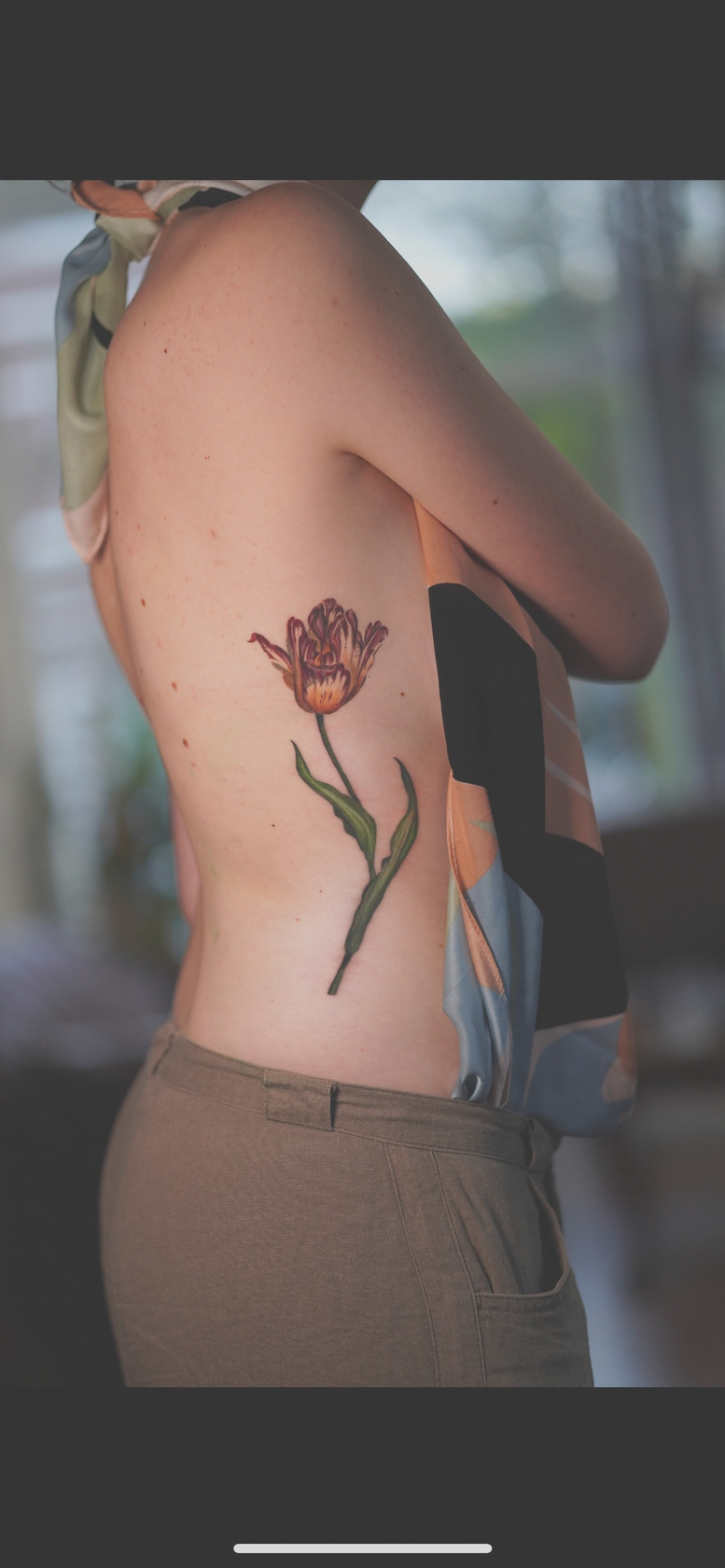 Projects I really enjoy are colour botanical tattoos, (fine line) micro colour tattoos, colour animal tattoos such as pet portraits, and birds etc. I always love to tattoo fruits, flowers and other plants. Last but not least, I also love making all kinds of delft blue tattoos! I am open to many projects so always feel free to send me a message and we can discuss further.